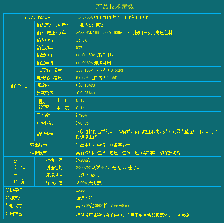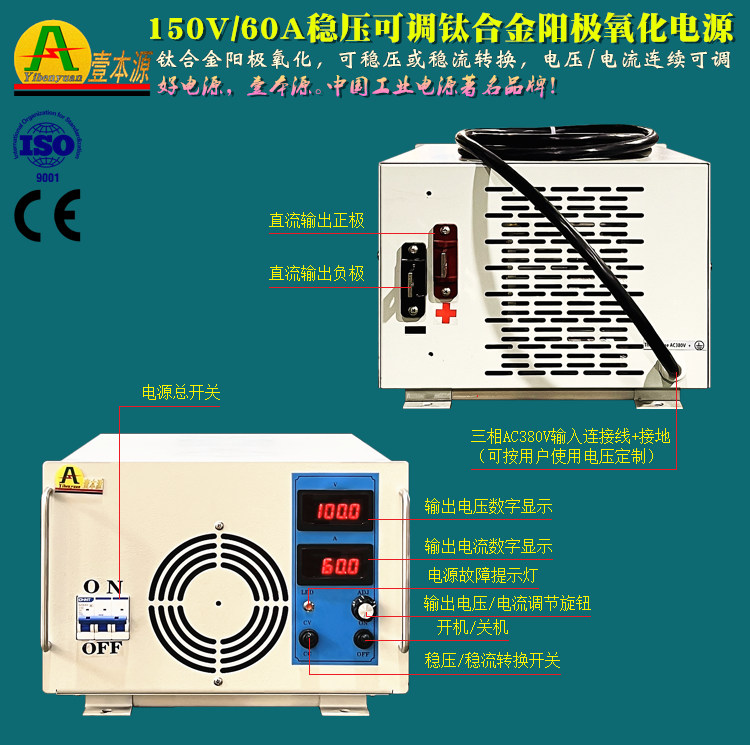 提供可调式低纹波稳压或稳流直流供电,适用于钛合金阳极氧化着色、硬质氧化