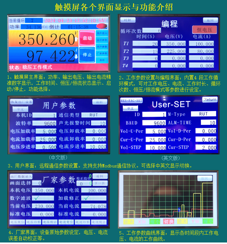 4、智能触摸屏显示与控制界面,界面直观操作简单。电压电流和功率3位小数点精准数字显示。可编程,可进行多种功能和参数设置。电源内置四段计时,一次可执行最多4组不同电压电流、延迟时间运行时间的设定,并可连续循环99999次。