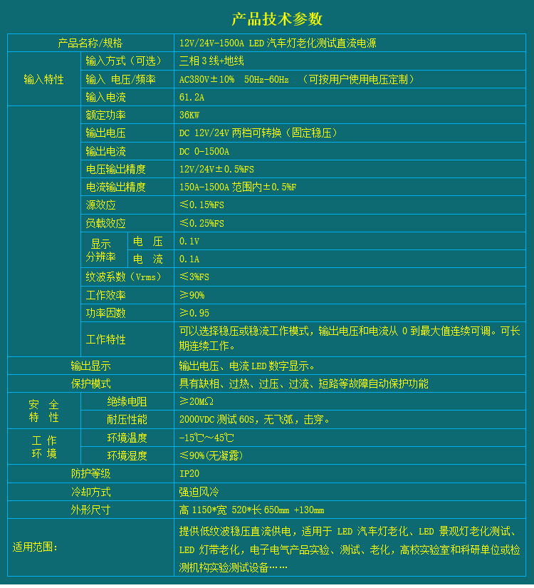 提供低纹波稳压直流供电,适用于LED汽车灯老化、LED景观灯老化测试、LED灯带老化,电子电气产品实验、测试、老化,高校实验室和科研单位或检测机构实验测试设备……