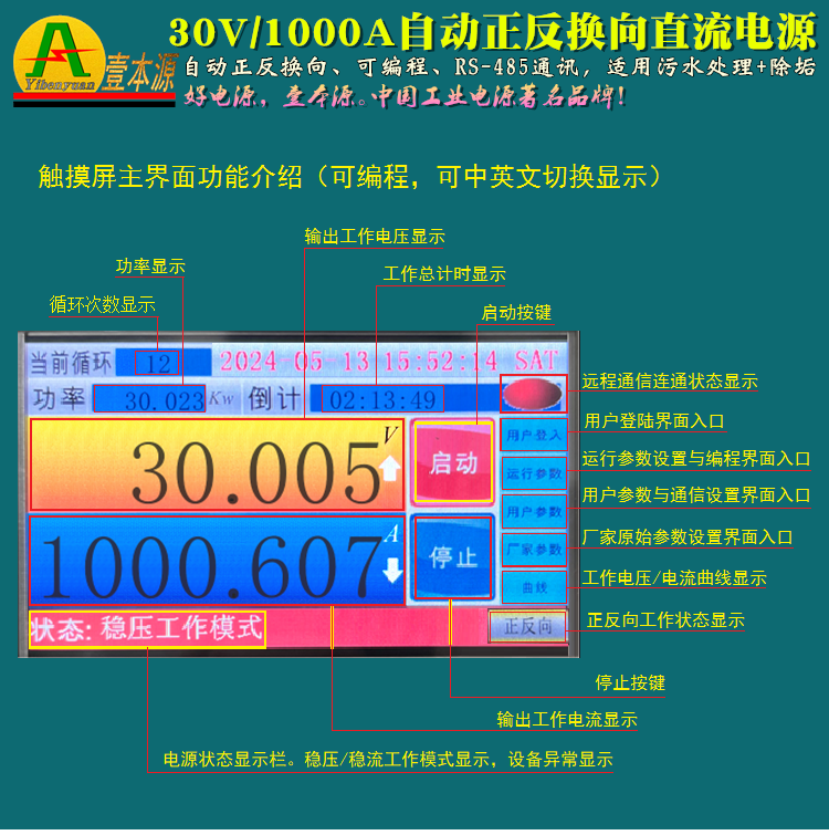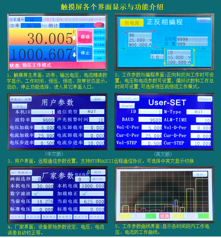 5、 智能触摸屏显示与控制界面,界面直观操作简单。电压电流和功率3位小数点精准数字显示。可编程,可进行多种功能和参数设置。