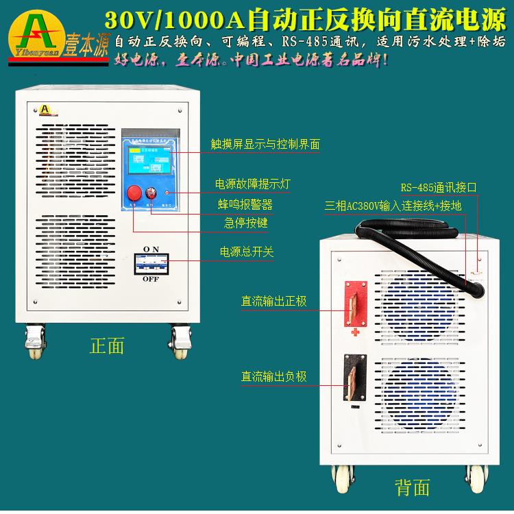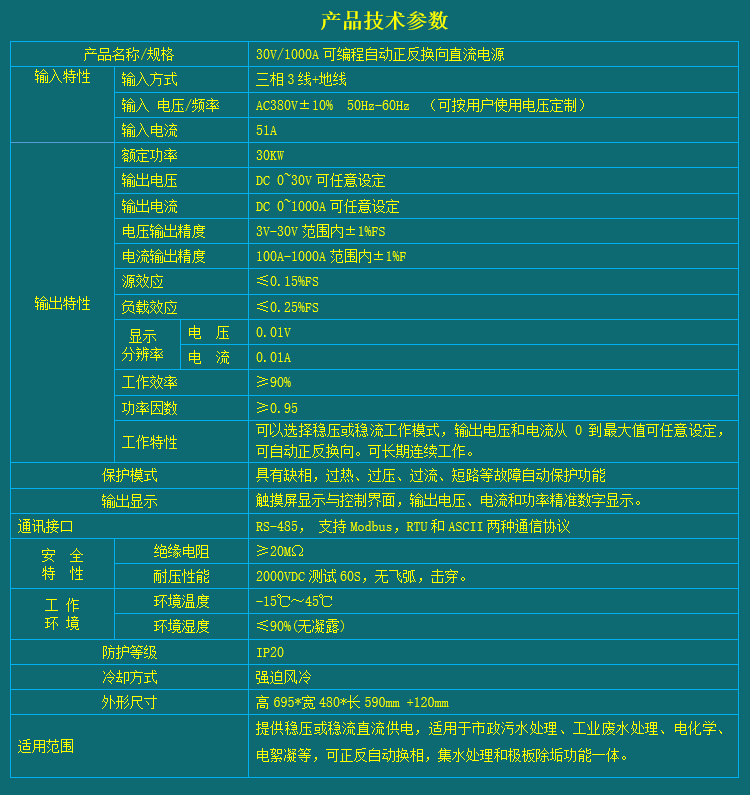 适用于市政污水处理、工业废水处理、电化学、电絮凝等,可正反自动换相,集水处理和极板除垢功能一体。