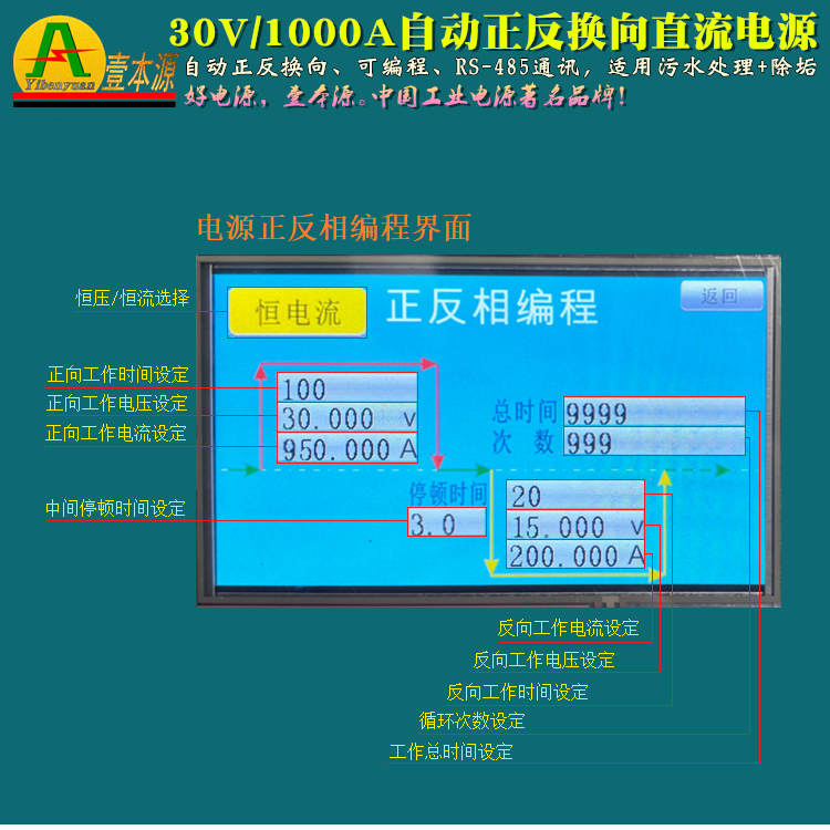 4、本电源使用电子换相技术,可正反向自动换向。正反向工作时间、电压、电流可设定,电源可在运行过程中按设定好参数进行正反向自动循环转换。