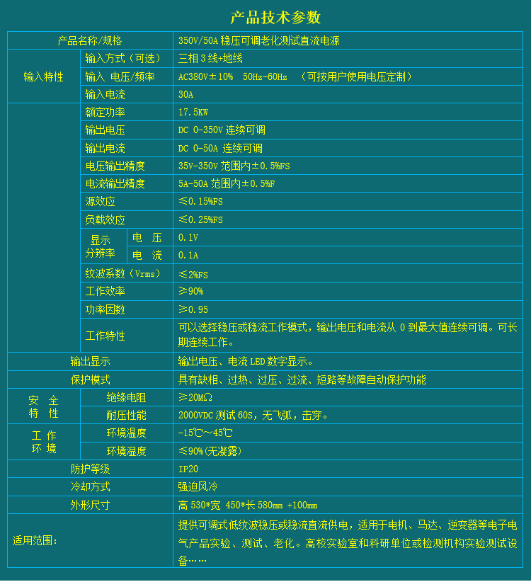 提供低纹波稳压或稳流直流供电,适用于电机马达老化测试、大功率电池充电、各种电子电器产品实验、测试、老化,高校实验室教学实验设备,检测机构或科研单位实验测试设备等.....