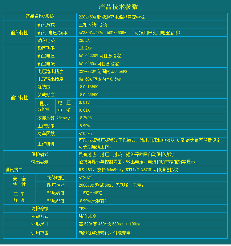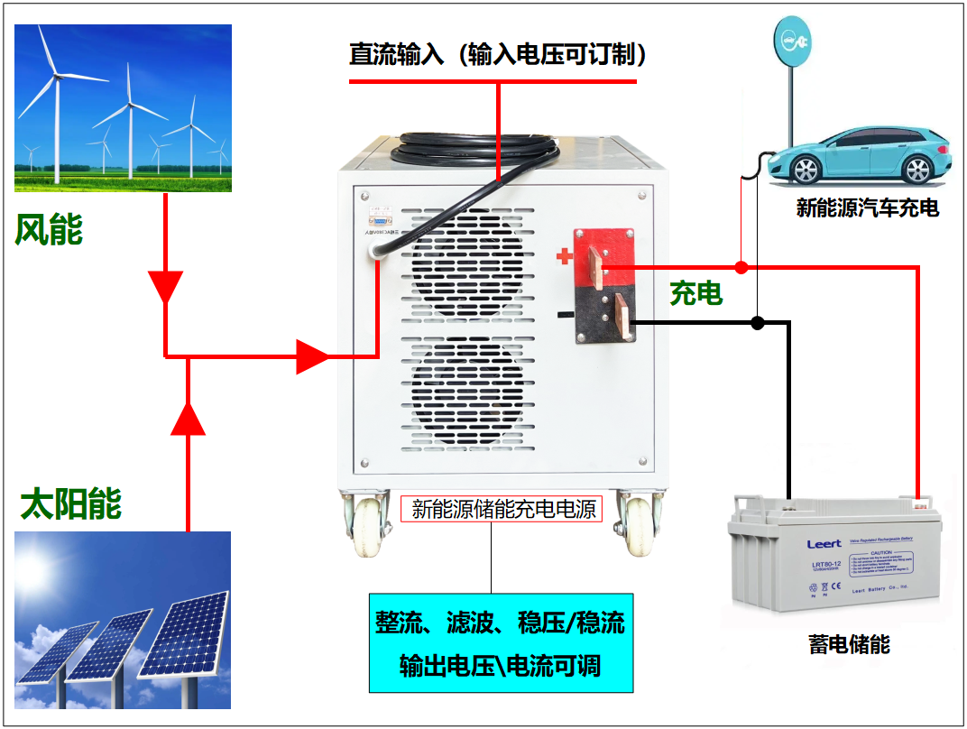 提供可调式低纹波稳压或稳流直流供电,适用于新能源整流转化,储能充电,户外太阳能路灯充储电等。