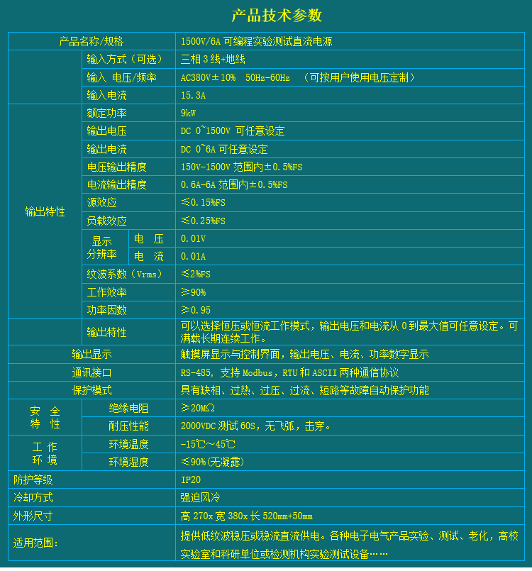 2、本电源采用目前世界上先进的控制系统PWM技术和稳定可靠的电路拓扑结构设计的控制线路,配用德国进口英飞凌牌模块(IGBT)控制。主变压器采用纳米晶磁芯和纯紫铜线绕制,散热好,功率足,功耗低,长久耐用,性能稳定。整流桥和整流管等主要部件均采用世界各地的优质材料,电源增加了本公司先进的LC滤波专利技术。具有输出纹波系数小,输出电压、电流可调节范围广,电压电流稳定精度高,检测数据精准等特点。