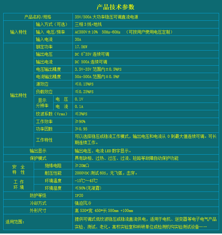 提供可调式低纹波稳压或稳流直流供电,适用于电机、逆变器等电子电气产品实验、测试、老化。高校实验室和科研单位或检测机构实验测试设备……